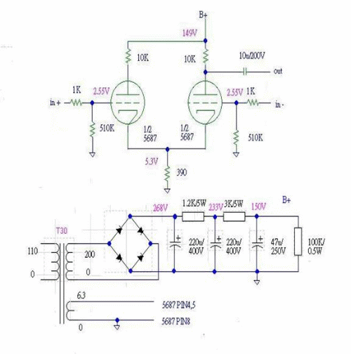 - ,此時的柵偏壓為負2.5VDC(以tube陰極為參考點).陰極偏壓決定後,可以依照tube的曲線圖算出線路圖各個電阻值及電壓值了.