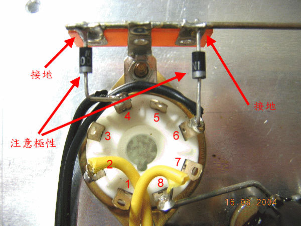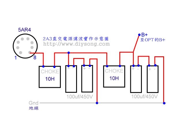 - 在上一章基礎篇我們知道,5AR4的燈絲是2-8腳,圖中黃色的線是來自變壓器0-5V抽頭,接上管座由順時鐘方向的第2及第8腳,第8腳再拉一條線至10H-Chock,注意缺口方向
