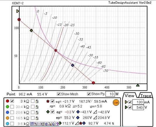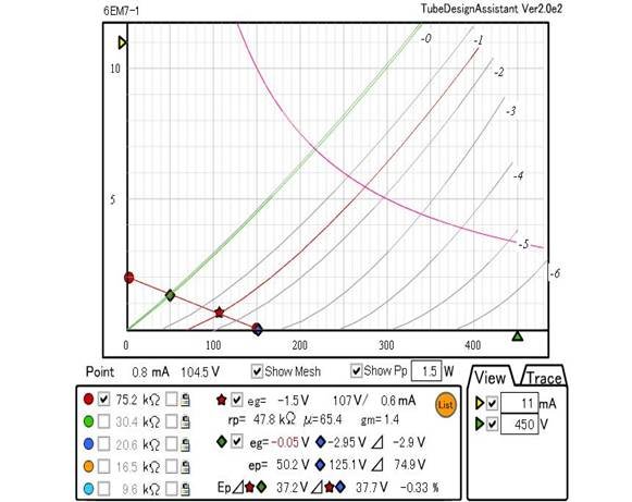 - 好,那來說明一下我們的工作點,驅動級的部分,因為施加穩壓的緣故,B+是150V左右,而我們的屏極電阻使用75K,大約是屏內阻的兩倍,此時的內阻約在33K,偏壓在-1.6V左右所算出的失真率在