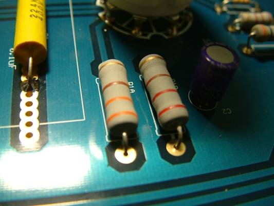 - 我們的設定是使用550R(220R+330R)負偏壓大約會在21.5V-22.5V間,但是真空管每支的差距都不小,會不會超過這個範圍實在難說,如果不準確,不是管子的壽命縮短,就是會提早失真,所以若是負偏壓有差距太大的事情發生,請自行買兩根電阻更換,若是負偏太低,在20V左右,請增加電阻的阻值,可將220R換成330R試試,若是負偏壓太高,就將330R換成220R,負偏就會下降,這也是我們將陰極電阻設計成兩隻串連的用意。