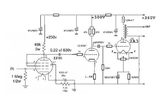 (1) 二個電壓放大級的屏級電阻可用DS PNP 恆流源代,這樣放大率可以接近管子的μ值,失真也可以變小, 甚至於三級容交可以變成二級容交. (2) 2A3的陰級電阻可用DS NPN 恆流源代, 這樣失真會變小. |