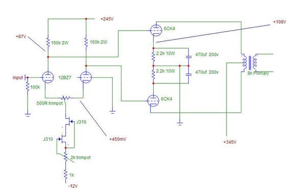 (1) 差動放大級的陰級恆流源可用DS PNP 恆流源代. (2) 二個6CK4的陰級電阻可用DS NPN 恆流源代,並將二個恆流源的值調成一樣,這樣做不但失真會變小, 低頻響應也會變好. |