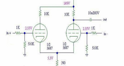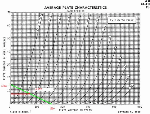 - 此時的柵偏壓為負2.5VDC(以tube陰極為參考點).陰極偏壓決定後,可以依照tube的曲線圖算出線路圖各個電阻值及電壓值了。