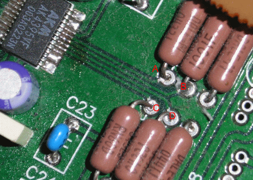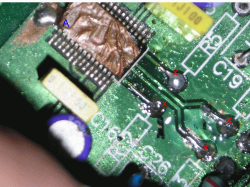 - 把同樣的東西移動到我的AD1855上。查看AD1855的Datasheet可發現Analogue out分別在12,13,16,17這幾支腳。再對上原來的PCB可發現圖中的A點大約是Pin1的位置,而標X的四個點,應該是走晶片下方出來的我們要取的四個點。