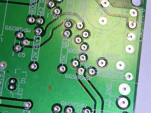 - 在一片通常在DZ訂來的電路板,底色是深綠色的(A點)是不導電不導熱的。而有銅鉑走過的地方則是淺綠色(B點)是導電且導熱的。如D點的焊點,只和其上方的焊點是導通的。而如C點的焊點和其周圍一大片都是導通的。