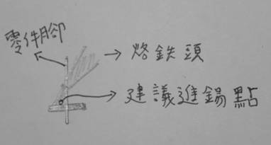 - 將烙鐵的尖端點在電路板上的焊點上,烙鐵的邊靠在零件腳下,則可以形成一個小三角形,這個小三角形是建議的進鍚點,進鍚的量稍加練習就可熟悉。通常一個焊點可以在三秒鐘之內完成。