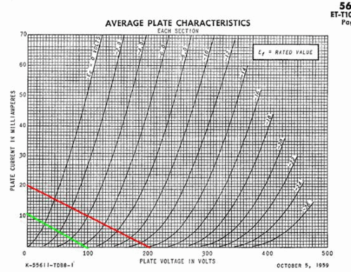 - 1. 如下圖中的紅線是一條10K的負荷電阻在供壓為200V時的Working line,通過(200V,0ma)及(0V,20ma)兩點。當接上這個負荷電阻後,真空管的所有工作值都要在這條線上。這句話的意思就是,因為三極管中的電流主要都是有通過這個電阻,所以一定要符合這個電阻的歐姆定律。