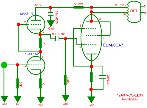 - 單端管機迷人之處是線路非常簡單,零件也好找,價格也相對的便宜,而線路更是有很多,不過要實做並不簡單,線路的抉擇也是很重要,在這個報告中,小弟選擇了12AX7當驅動管,SRPP線路.而後面功率放大管的部份,是用EL34,三極接法,而整流管則是用5AR4C-L-C濾波