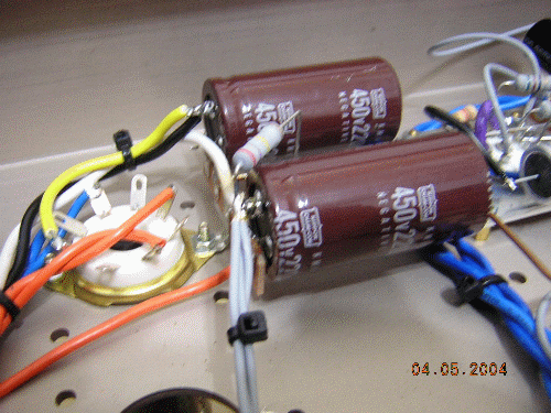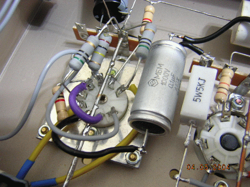 - 小弟對電阻並不太要求,手邊有的2W水泥電阻就焊上,右上方的白色電容是陰極旁路電容,應該是某大品牌喇叭用的分音器電容10uf/400V