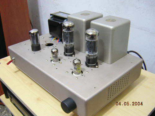 - 機箱不用說,採用ACSP管機機箱,管子剛剛好6個洞,1支5AR4當整流管,2支12AX7當驅動管,2支EL34當功率管,還有一個洞來裝個貓眼管,看起來一切是那麼美好~