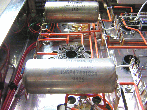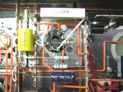 - 上圖:預計將交連電容(黃色的那2個) 拆下,將Vitamin Q前移至小九腳管座的旁邊