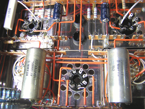 - 為了怕電源整流管與信號互相感染雜訊,在位置編排上特意將交連電容與整流管座離開一段距離,同時因為這個電容的接腳已經不是很長(Used品),所以要先焊在搭棚架上再使用20AWG鐵弗龍銀線加以連接