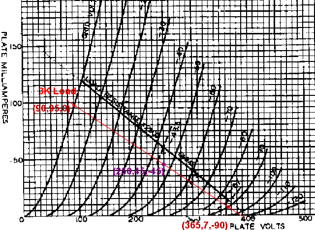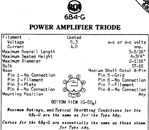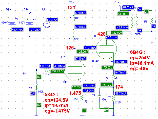 先看一下 6B4G 的工作點,設 B+ 約 430,工作點取 ep=250,ip=45,eg=-45;則實際電壓為 Ep=430,Ek=180,Eg=135。這樣的話陰極電阻取 180/0.045=4000,旁路電容為 159/(4*2) = 20uF。功率計算值為: Pw = (Vmax-Vmin)(Imax-Imin)/8 = ((365-90)(90-7)/8000 = 2.85W 再看 5842,工作點取 ep=130,ip=17,ek=-1.5,陰極電阻為 1.5/0.017=88。由於使用屏極電感而使得增益大增,陰極旁路電容在此已是調音的成份,我們忽略它。