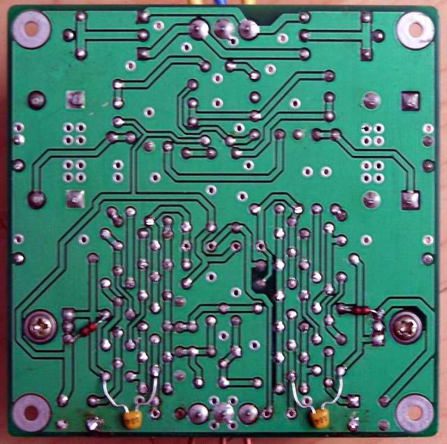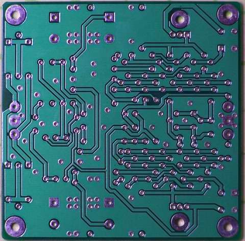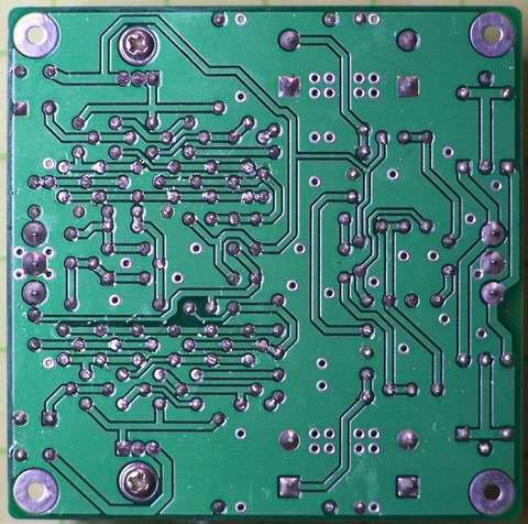 PC板零件面與焊接面全都鋪銅做為接地面,增加屏蔽的效果。而且還多鑽了很多小孔,貫穿上下兩個接地面,用以降低接地面的阻抗。