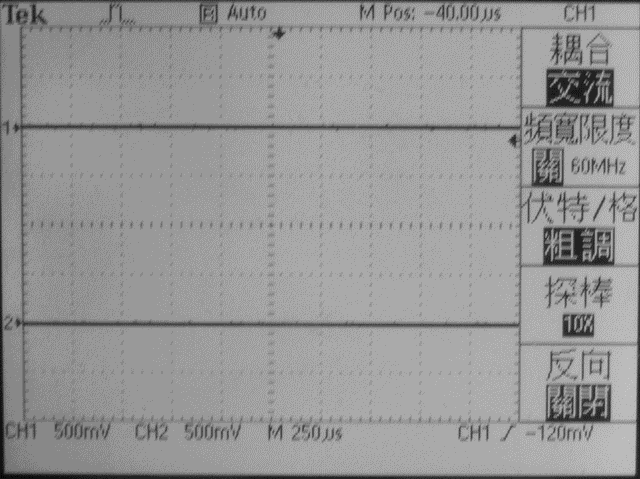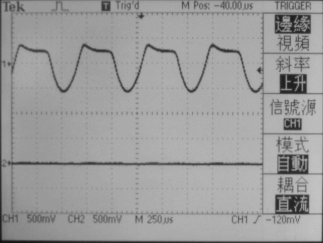 其+15V輸出的MOSFET晶體G極上的波形如下圖中的CH1, CH2