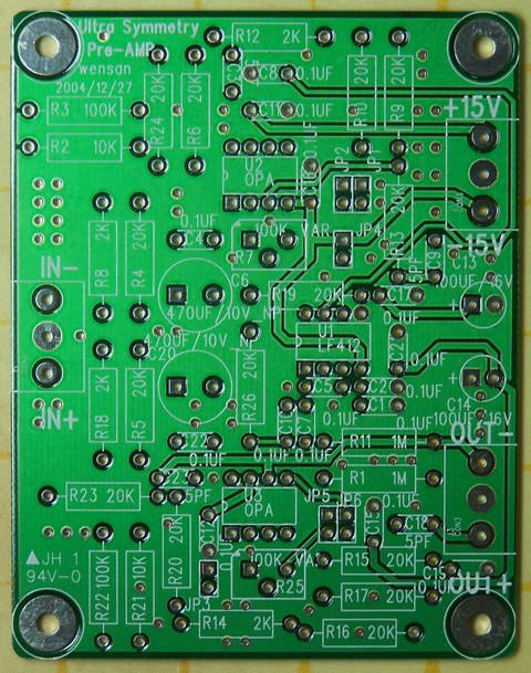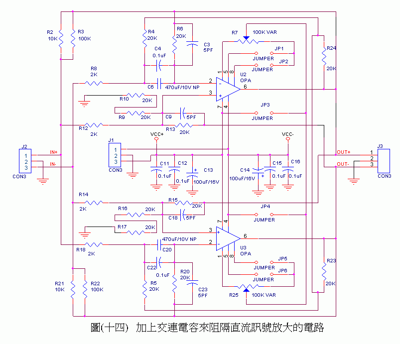 因此這個PC板不論是要裝成圖(十三)的直流放大器、圖(十四)的交流放大器,或是圖(十五)加上直流伺服電路的放大器都可以。