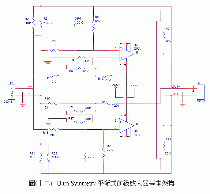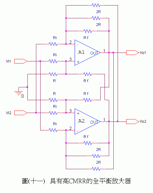再將圖(十)的電路巧妙的切開來,便形成如下圖這樣“具有高CMRR的全平衡放大器”!