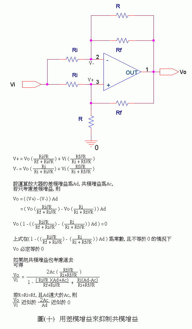 將圖(九)的電路加上兩個電阻成為圖(十)那樣,使運算放大器的反相輸入端的回授量大於同相輸入端,那麼當運算放大器的差模增益非常大時,不論Vi為何值,Vo都會趨近於