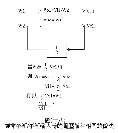 圖(十二)的電路在非平衡輸入時的電壓增益會因為反相輸入端接地或浮接而有所不同。
