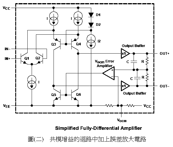要解決全平衡放大器輸出兩個輸出電位一起漂移的問題,一般採用的方法是像下圖這樣,在共模增益的迴路中加上誤差放大電路: