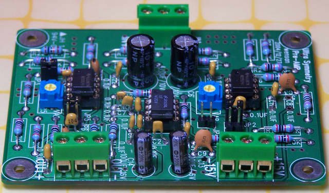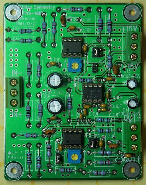 NE5534的中點微調是接第 1、第 8腳,半可變電阻中間腳接正電源,因此要將JP2、JP3、JP5短路起來。