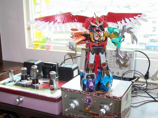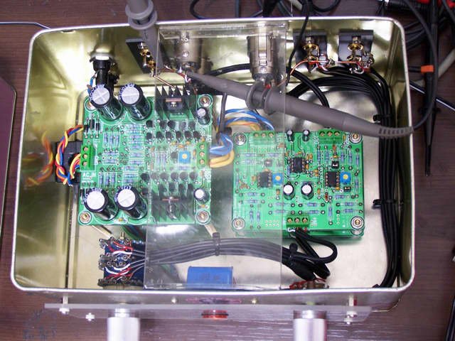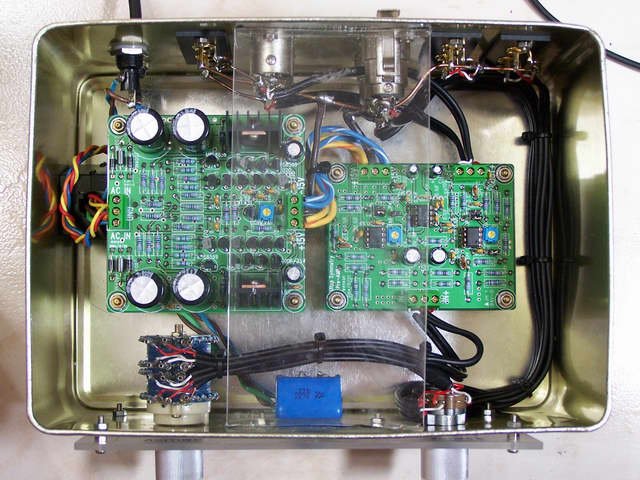 餅乾盒內部的佈局如上面的照片所示。右邊是兩塊 Ultra Symmetry 平衡式前級放大器疊在一起,左邊是我所設計的 Ultra Symmetry 穩壓電路,穩壓電路下面是環型變壓器,音量控制器當然是使用我所設計的 10K串列型級進音量電位器。