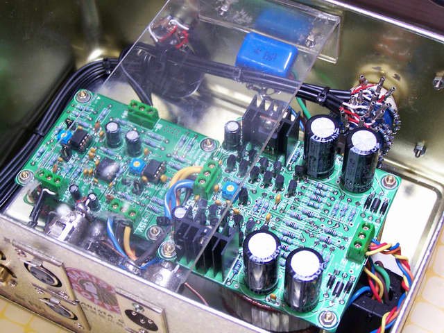 電路板上有兩個調整輸出中點的半可變電阻,調整時一邊以電表測量兩個輸出對地的直流電位,一邊反覆調整兩個半可變電阻,讓兩個輸出對地的直流電位達到最小。