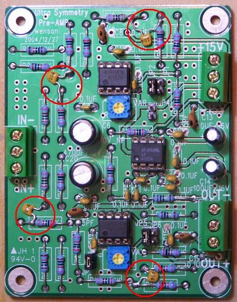 如果各位並不會在輸入端連接音量電位器,或連接音量電位器之後仍然會振盪的話,可以將R3、R22這兩個100K的電阻拿掉,減少正回授的量,或者像下圖中圈出的四個位置加上 0.1μF基層電容做補償即可。