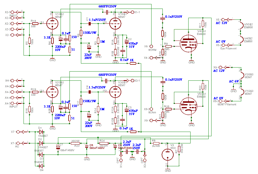 剛裝好6EM7真空管放大器放音樂試聽時,就發覺EM800的擺幅很小,平常聆聽音樂時的音量大小根本看不出EM800的擺動,上網找到EM800的資料,發現要-8V~-10V的電壓才能將EM800驅動到滿格,EM800的驅動訊號接輸出變壓器的8Ω輸出端時,訊號擺幅實在太小,便找來100KΩ電阻和0.1uF/250V電容串聯,動手將EM800的驅動訊號由輸出變壓器的8Ω輸出端,改成經由100KΩ電阻和0.1uF/250V電容串聯接到3KΩ輸入端。輸出變壓器的阻抗比3KΩ:8Ω,換算成電壓比為19.36:1,也就是說輸出變壓器3KΩ輸入端的訊號電壓比8Ω輸出端大了將近20倍,用來驅動EM800可以大幅增加擺動的靈敏度,而且3KΩ並上幾百KΩ電阻時,相差近百倍,負載效應非常小,不會對輸出信號有不良影響。