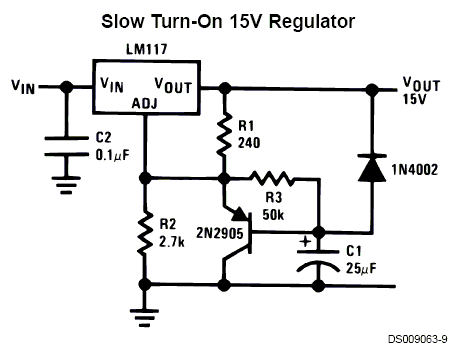 由於真空管燈絲在開機瞬間會有比正常工作電流大上5、6倍的湧衝電流產生,因此一般燈絲穩壓電路都會有電壓緩升的設計,像上圖便是LM317 Data