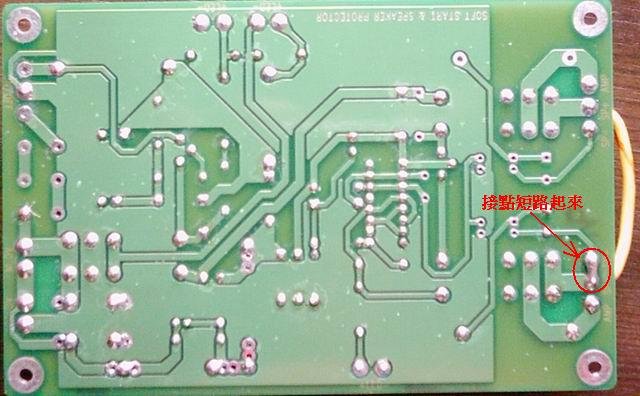 【「燈絲緩衝、高壓緩送」電路銲接面,注意圖中標示的接點要短路起來!!!】