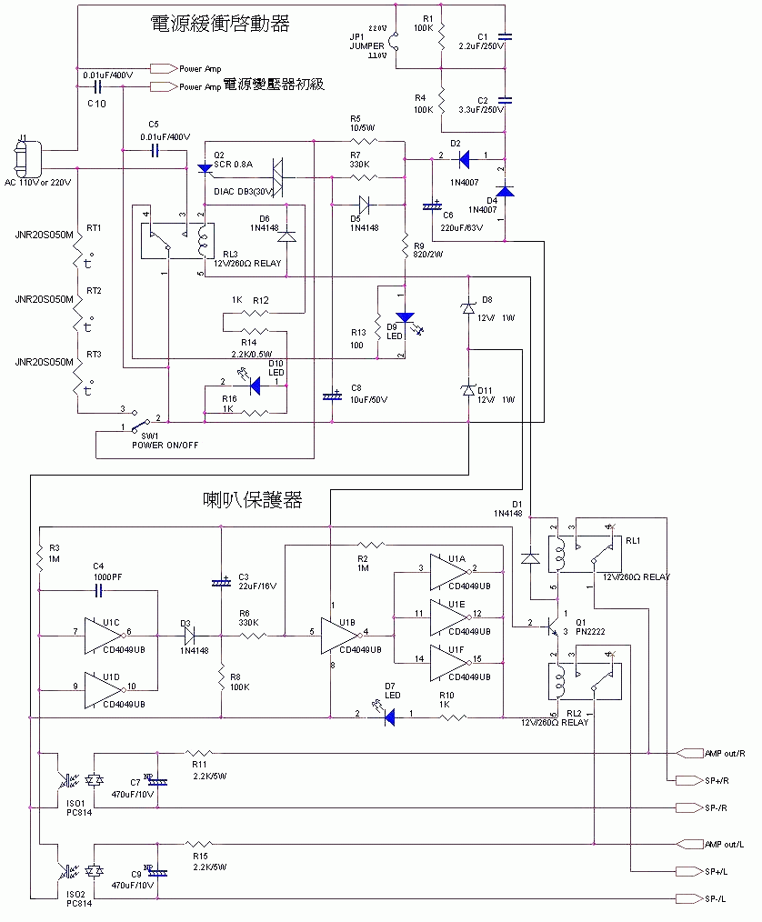 由於不需要做直流偵測的動作,所以PC814光隔離器及470uF/10V無極性電容、2.2K/5W電阻不接,這樣喇叭保護器電路就成為單純的延遲開關電路。