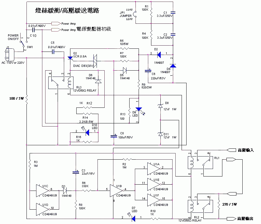 真空管放大器的高壓電源之所以要加上緩衝,是因為在高電壓的狀況下,繼電器接點在開關的瞬間如果有大電流流過,會產生很大的火花放電現象,對繼電器的接點損傷極大,繼電器的接點用不了多久就報銷了!其實繼電器的絕緣能力絕對能承受上千伏的高壓,但繼電器的接點卻無法在高電壓的狀況下,在開關的瞬間承受大電流流過。所以用兩個繼電器跟電阻接成緩衝電路,讓繼電器接點在開關的瞬間不會流過大電流,便可以有效保護繼電器接點。
