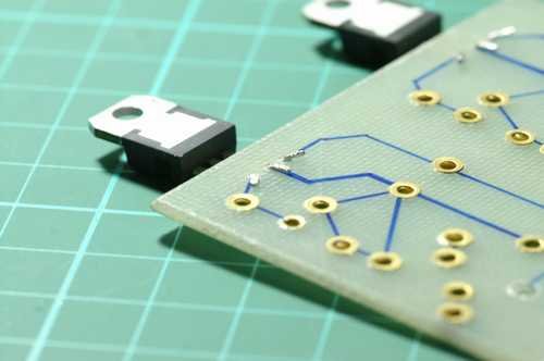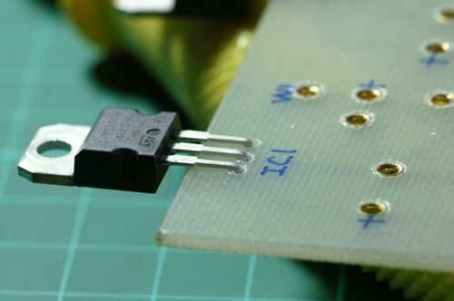 上圖:先將78S05的腳位稍微的折好固定在PCB上,請注意這PCB上的78S05腳位我們並沒有打上銅扣,最主要的目的是不希望因為銅扣而造成短路的情形,是安全上的考量 |