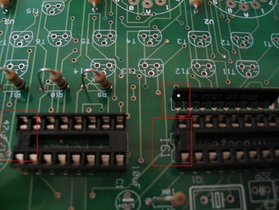 - step3:依序焊接IC座,及排阻(請注意方向)IC做的缺口要和PCB板上的一向,排阻的第一PIN(白點處),要與PCB標示一致.