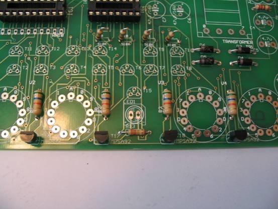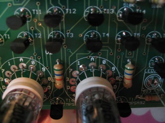 - 圖說:NIXIE管旁為MPSA92晶體,共4只(電晶體標示符號與實際晶體相反)平面向上