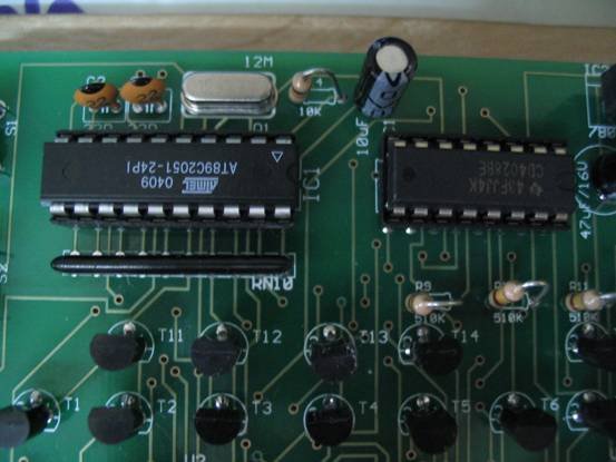 - step8:裝上89c2051及4028,注意IC的接腳.圖說:IC的接腳必須正確.