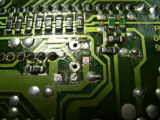 這時就需要注意一下囉!PCB上有3個裝銅柱的地方,其中2處在最外側,與PCB的鋪地銅箔無接觸,1處在內側,正好在電容的負極線路上並鍍錫。