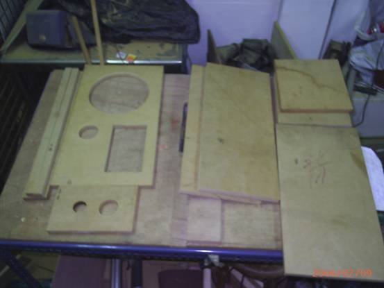 上圖是這組音箱全部所用到的板子,另外還有固定低音單體用的圓環沒有照進去,前板的洞都是盡量依照原來的音箱下去挖的,另外最左邊的是固定活動板的木條。