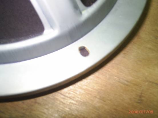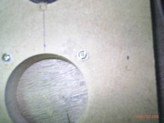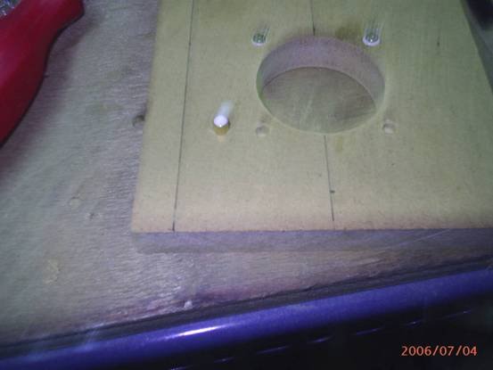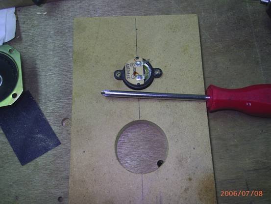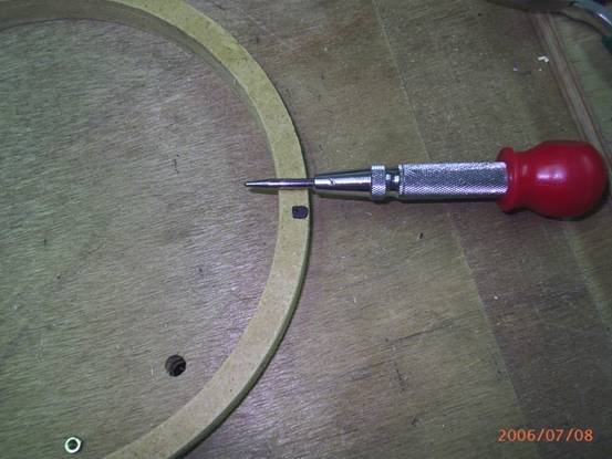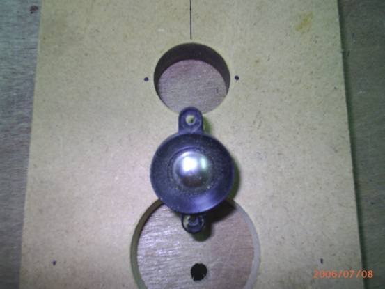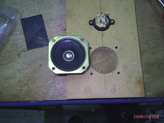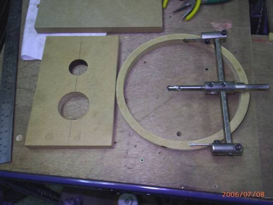 上圖右邊是固定低音單體的圓環,左邊是固定兩顆高音單體的板子,壓在圓環上的是自由錐,這玩意可好用了,用它挖出來的圓洞一等一的漂亮(可是尺寸就有點%&*)。