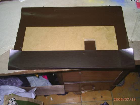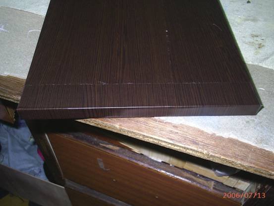 前板的貼皮與其他部分來比較是簡單了許多,只要把木皮撕開貼上後,在把洞和多餘的部分切掉就好了