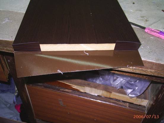 另外,木皮在貼以前,要先裁好,面積大概是比要貼的部分四邊各多出五公分左右,等貼好後在用美工刀切掉就可以了