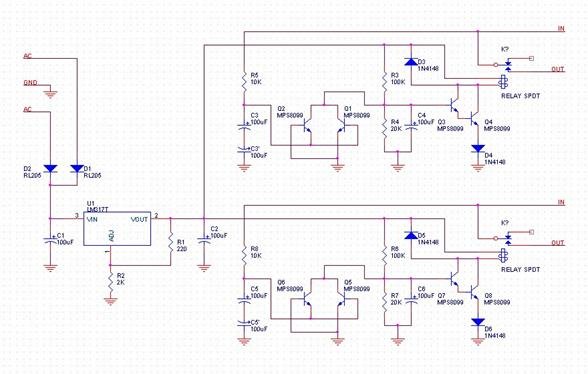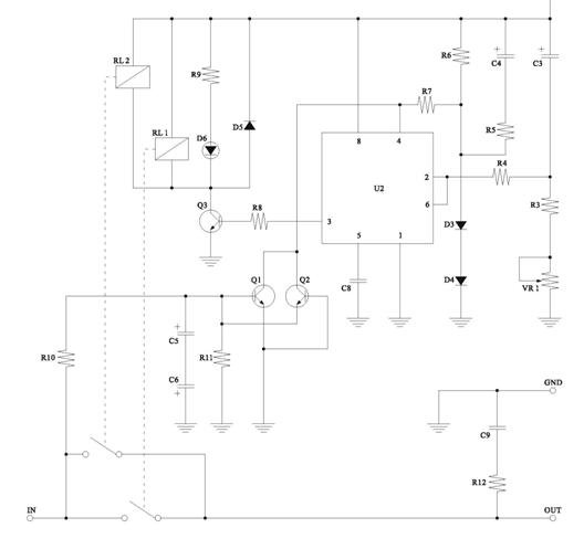 - ·íC3³vº¥¥R¹q¡A¨Ï 2¡B6¸}¬°§C©ó1/3Vcc®É¡A²Ä3¸}¿é¥X¬°°ª¹q¦ì¡AQ3¾É³q¡ALED(D6)«G¡ARELAY¾É³q¡C©µ¿ð¬í¼Æ¤j¬ù¬°((R3+VR1)*C3)*1.1¡A¦]¦¹¥iÂǽվãVR1¨Ó§ïÅÜ©µ¿ð¾É³q®É¶¡¡C¥»®M¥ó±Ä¥Î¨âÓG2R1-E¨ÃÁp¿é¥Xªº³]p¡AÀ³¥I¤j¹q¬y¿é¥X®É»´ÃP¦Û¦b¡A¥i¾A¥Î©ó¶W¤j¥\²v©Î¶W¤j¹q¬y¿é¥Xªº«á¯Å¤¤¡CR10¡BR11¡BC5¡BC6²Õ¦¨ªº§C³qÂoªi¾¹»PQ1¡BQ2©Ò²Õ¦¨ªºª½¬yÀË´ú¹q¸ô¡A·íÀË´ú¨ìAMP¹L°ªª½¬y¿é¥X®É¡AÂǥѱ±¨îRESET(²Ä4¸})ªº¹q¦ì°ª§C¡A¥ç·|¨³³t¤ÁÂ_»P³â¥zªº³sµ²¡A¹F¨ì«OÅ@³â¥zªº¥Øªº¡C