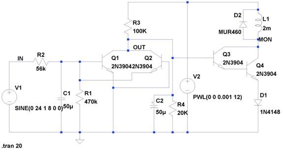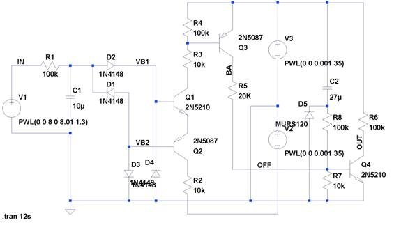 ¨ä¤¤Q1, Q2¬O°»´ú¥¿tª½¬yªº¥D¨¤. ¶}¾÷«á¦p¨S¦³ª½¬y, Vcªº¹q¦ì¥ÑR5¨ÑÀ³¤@ª½¤Wª@, Vout¤]¤@ª½¤Wª@¨ìQ4, Q5¹FÆF¹y´¹Åé§Ö³t¾É³q.