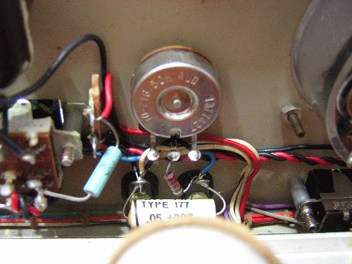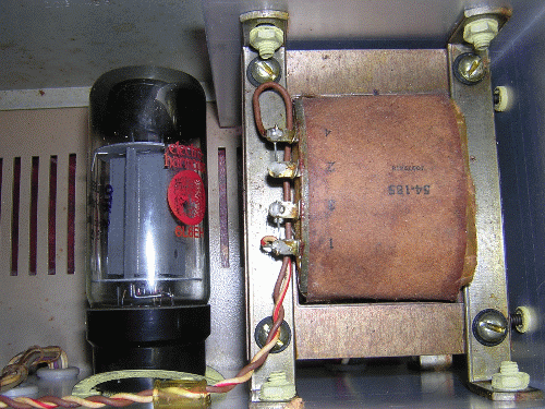 - 首先硬入眼廉的,是二根在變壓器旁的6L6H,經過了長久歲月還是那麼明亮動人,變壓器是鎖在隔板上的,6L6也放橫向的節省空間,而與變壓器是最短的路徑,我們可以輕易的判斷是用來整流.