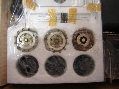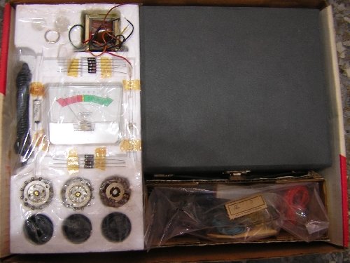 上圖:初入眼簾的是零件所有的擺設,右上方的黑箱子就是測管機本身的機箱,設計是可以像007手提箱可以帶著走的(這部份後面有照片),左邊的就是測管機所需要的零件,有波段開關,表頭,變壓器,和一些被動原件,而在下方的是一些線材