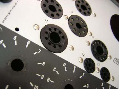 上圖:打開右上方黑色提箱的蓋子,我們可以看到所有版面的配置方式,在右上方的是裝表頭的大圓洞,下面則是切換燈絲,高壓,及負壓的切換開關組,整體配置上散發出濃濃的古典意味.