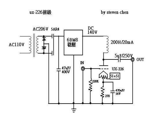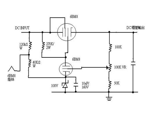 由於前級放大器對電源的要求甚於後級放大器,所以在此由6BM8作為高壓電源的穩壓,直熱管為減少因燈絲感染的哼聲,也必須使用直流穩壓點燈.
